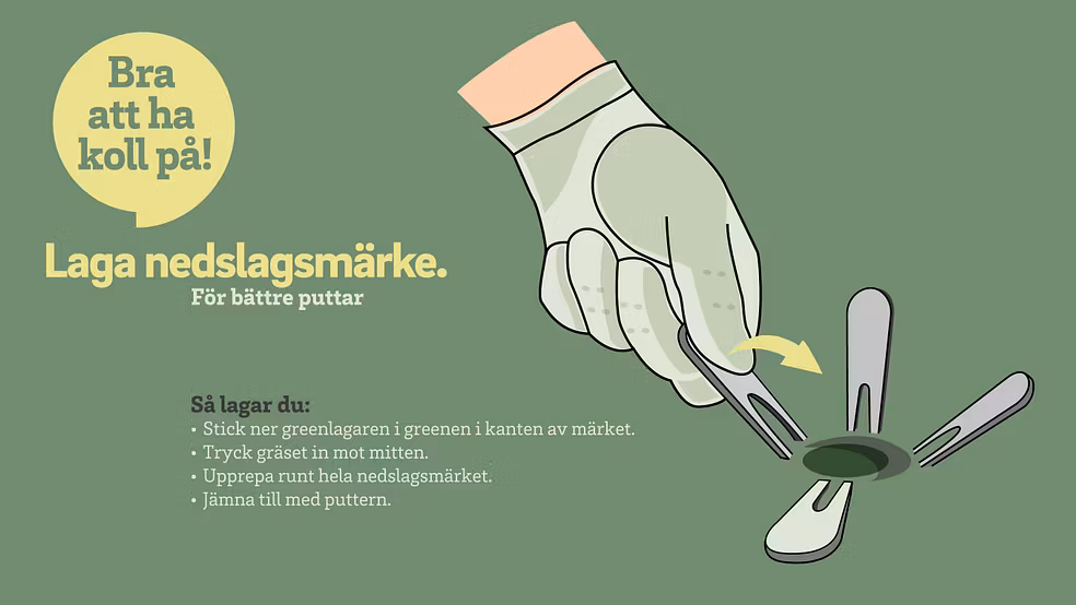 Förklara hur man tar hand om banan, som att laga nedslagsmärken, återplacera uppslagen torv och kratta bunkrar.